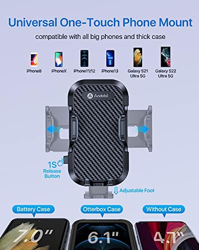 • [Adjustable Foot Design, Universal Compatibility ] - Andobil product manager designed adjustable foot of car phone holders. Avoid some cell phone power or volume button will be squeezed by the clamp arm. Meanwhile, the adjust foot improve the compatibility making this car cell phone holder fit for all smartphones. BTW, You don't need to remove your thick case while using this phone holder car. - Big Phones & Thick Case Friendly